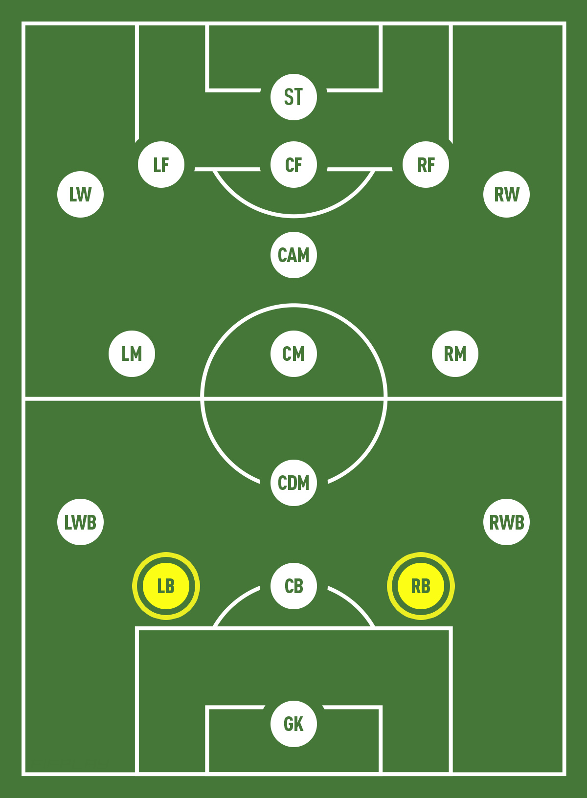 A full-back is usually positioned in the right-side or the left-side of the field based on their preferred foot. They are required to have good attributes for defending, tackling, marking, pace and vision.