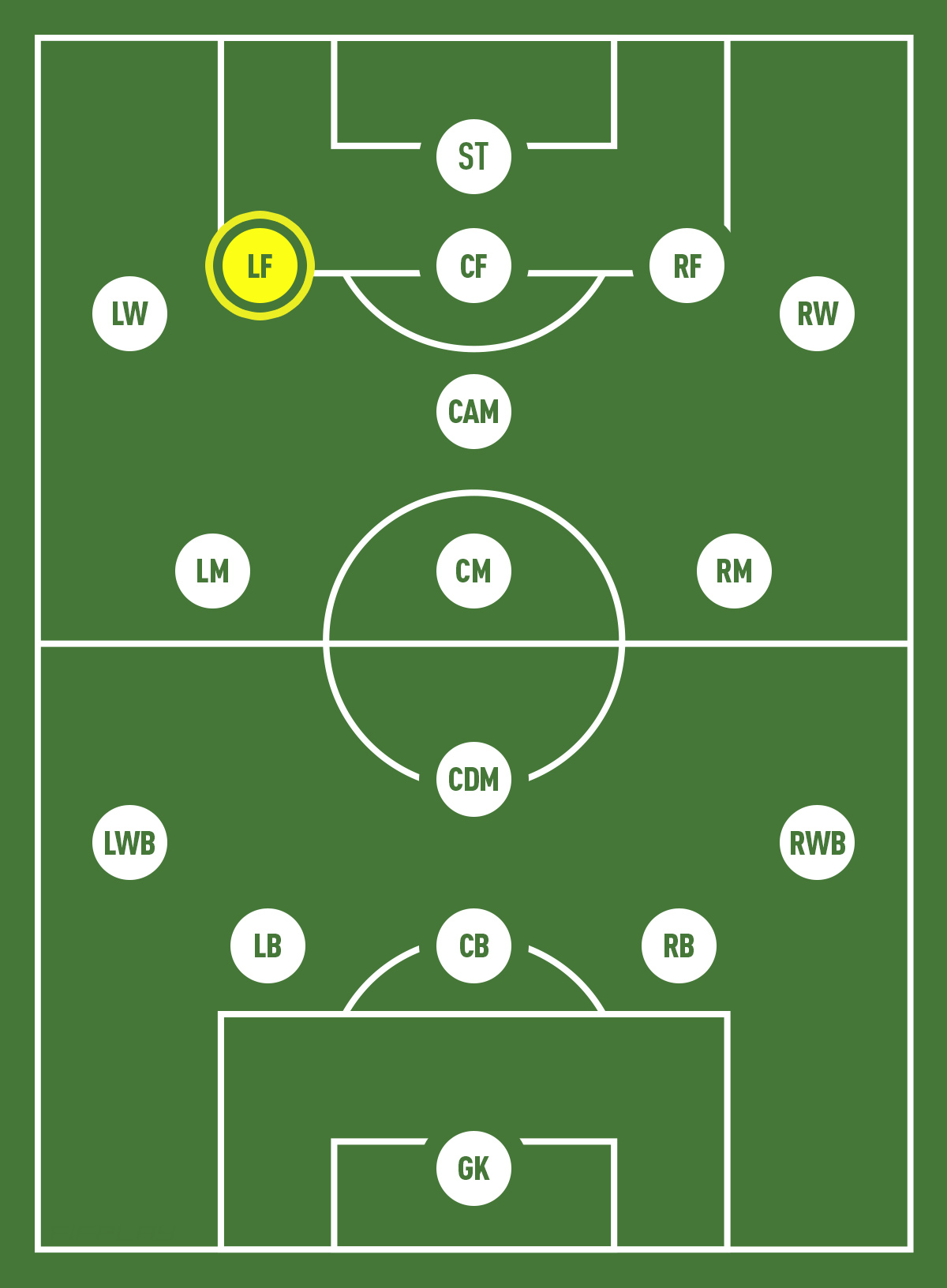 A Left Forward (LF) is an inside forward who plays on the nearest left side to the opposing team's goal and is most responsible for scoring goals for their team.