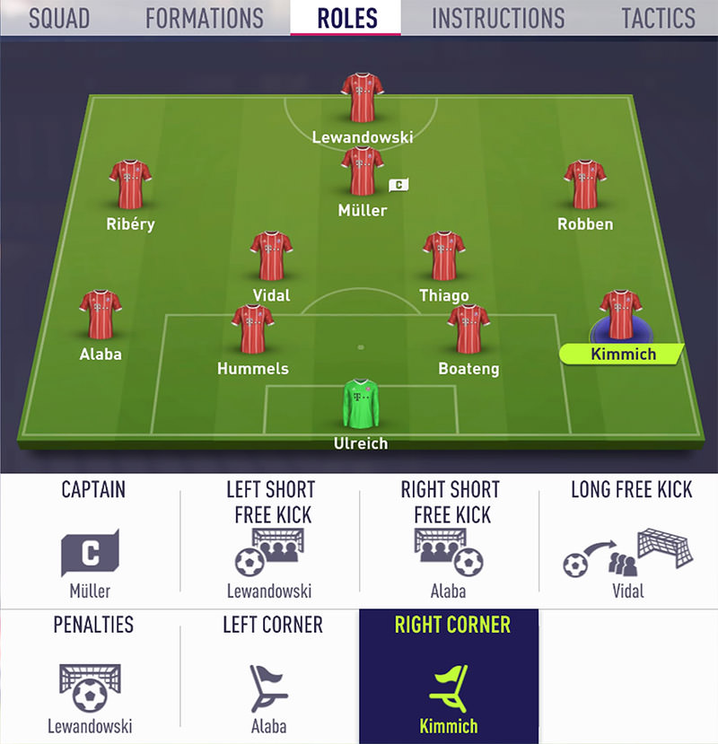 Taking left corner kicks. A right-footed player with good attributes like Long Pass, Short Pass, Passing (PAS), Curve and Free Kick Accuracy (FKA) would be idea to be assigned to this role. |